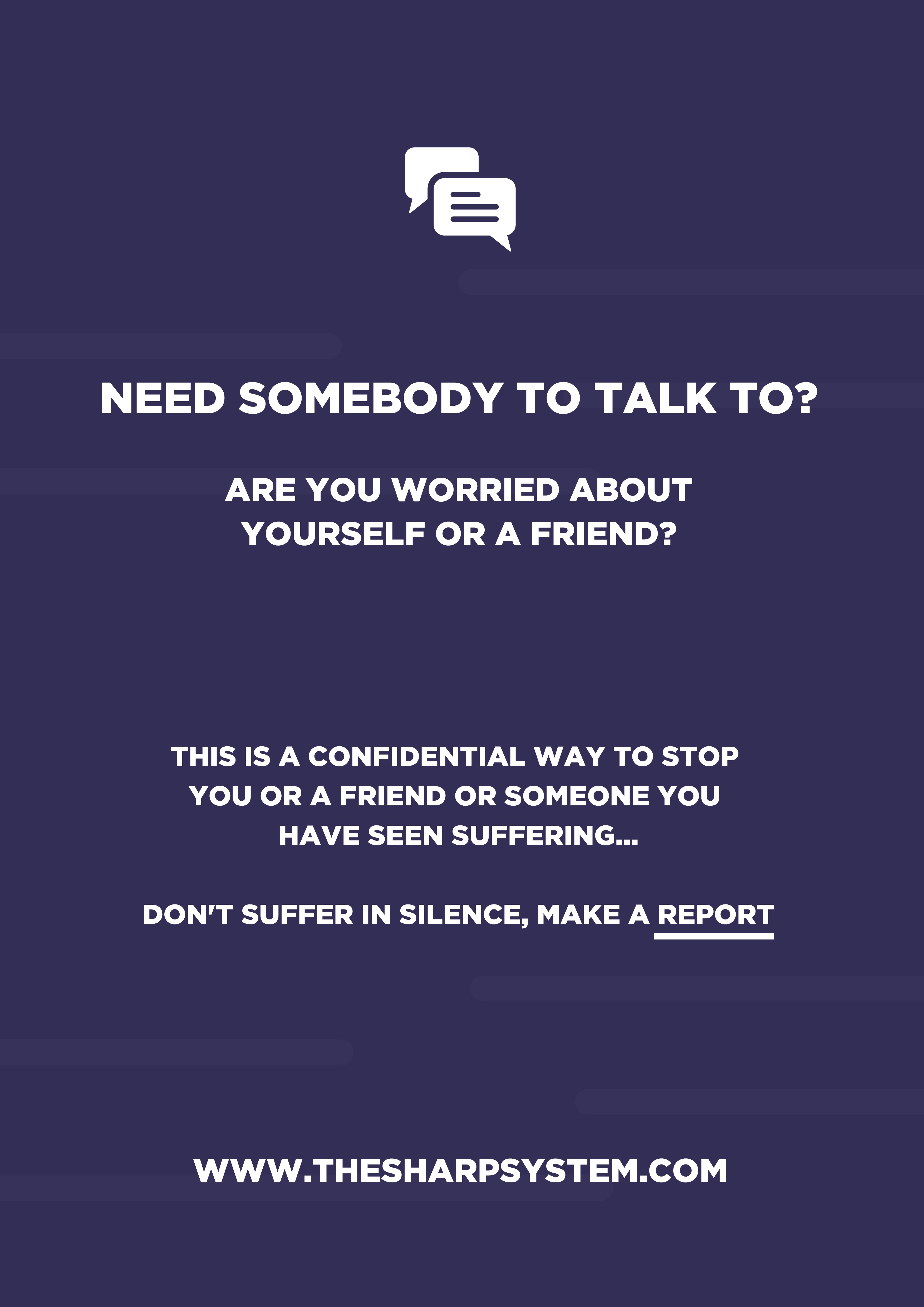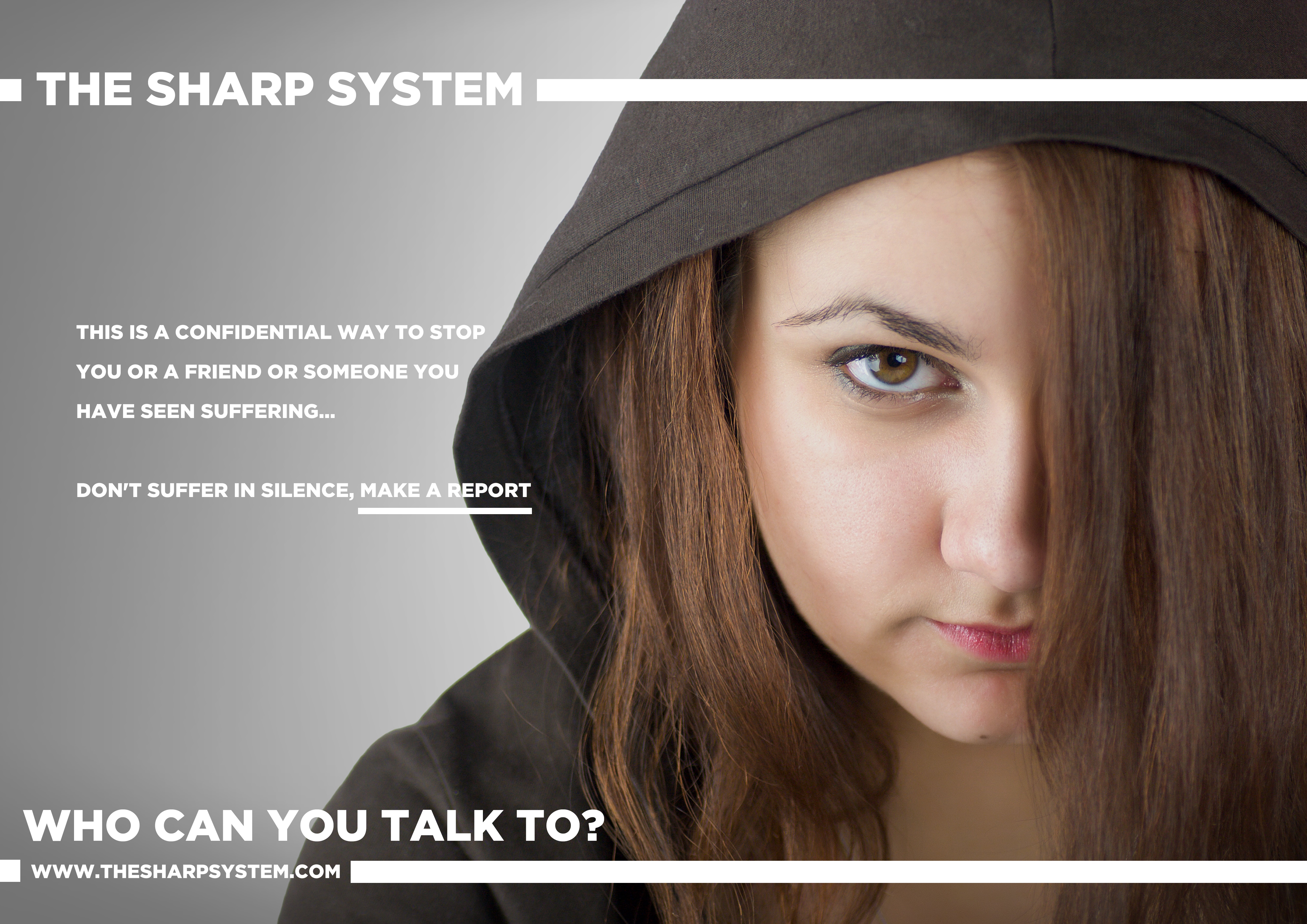 SHARP Allows young people to report any incidents which occur within the School and local community anonymously and without fear . Aside from the reporting tool SHARP delivers educational content to raise awareness on a wide range of subjects incluing Bullying , Health , Community Issues , Weapons and Hate Crime.